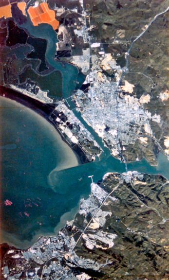 Color image from multispectral data of San Pablo Bay, California. Area covered is the same as in Figures 1-23 and 1-24. Courtesy NASA Ames Research Center.